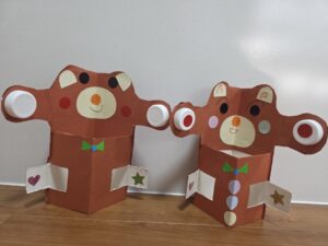 11月の製作は「くまのカスタネット」を作りました。 くまの両手を動かして、ペットボトルキャップ同士を合わせるとカチカチと音が鳴ります🎵 「おもちゃのチャチャチャ♪」の歌に合わせて繰り返し遊んだりもしましたよ⭐ 2025/11/20 「今月のこひつじ」記事一覧へ